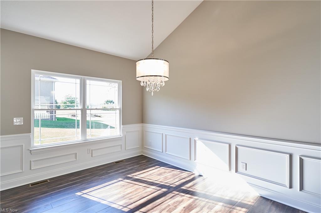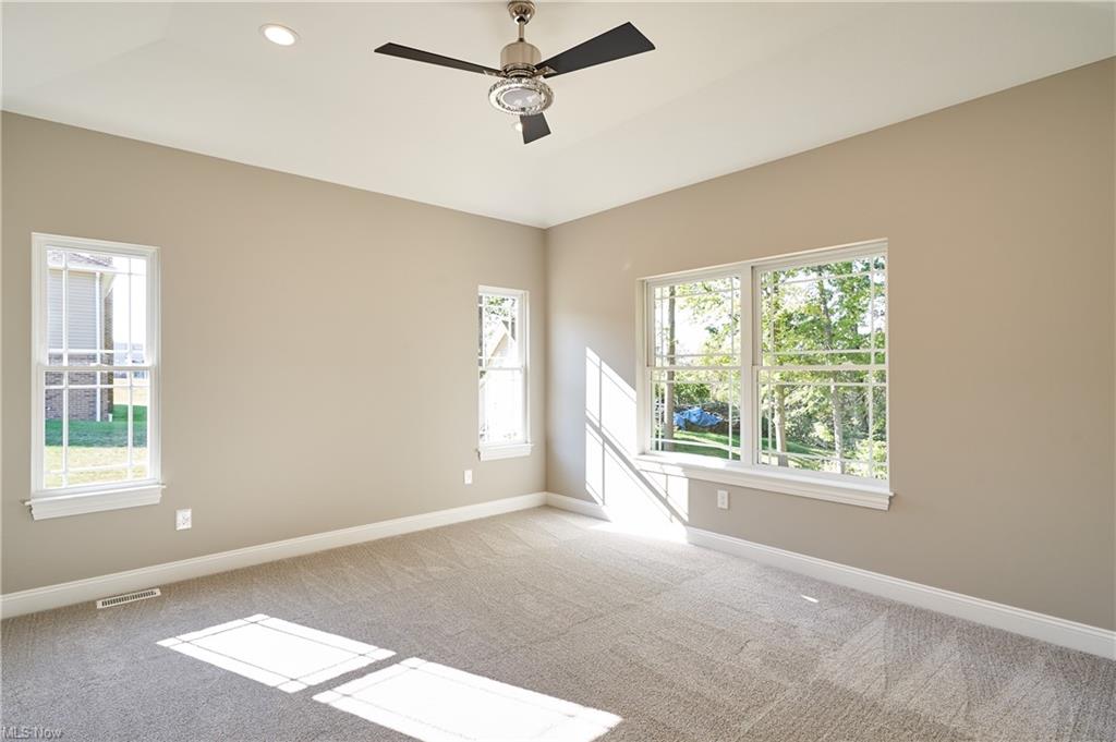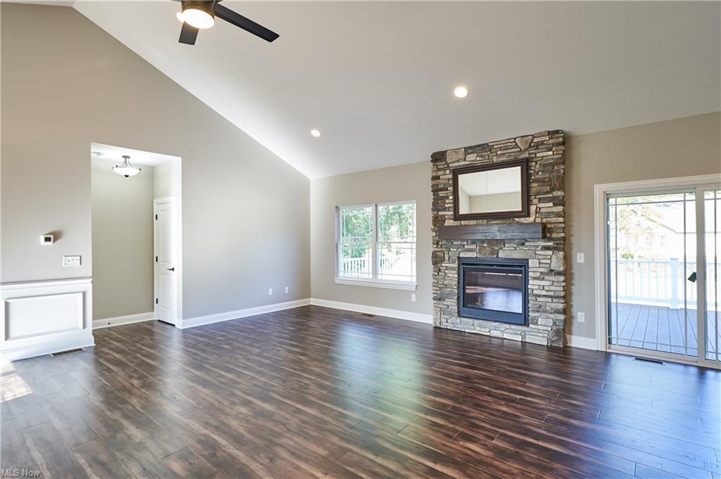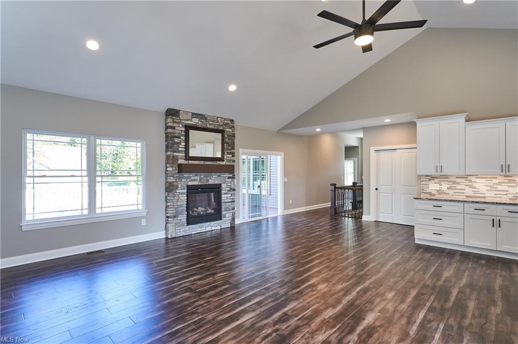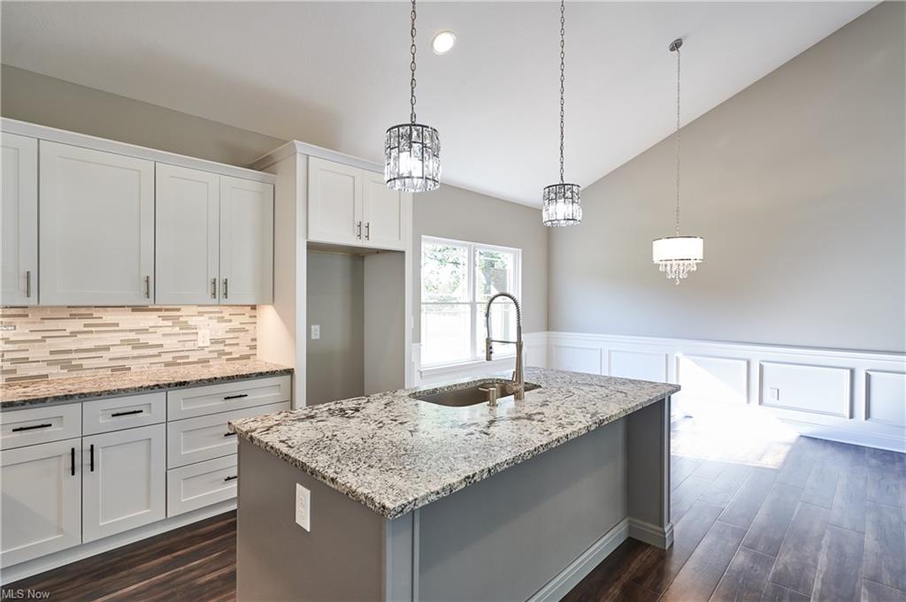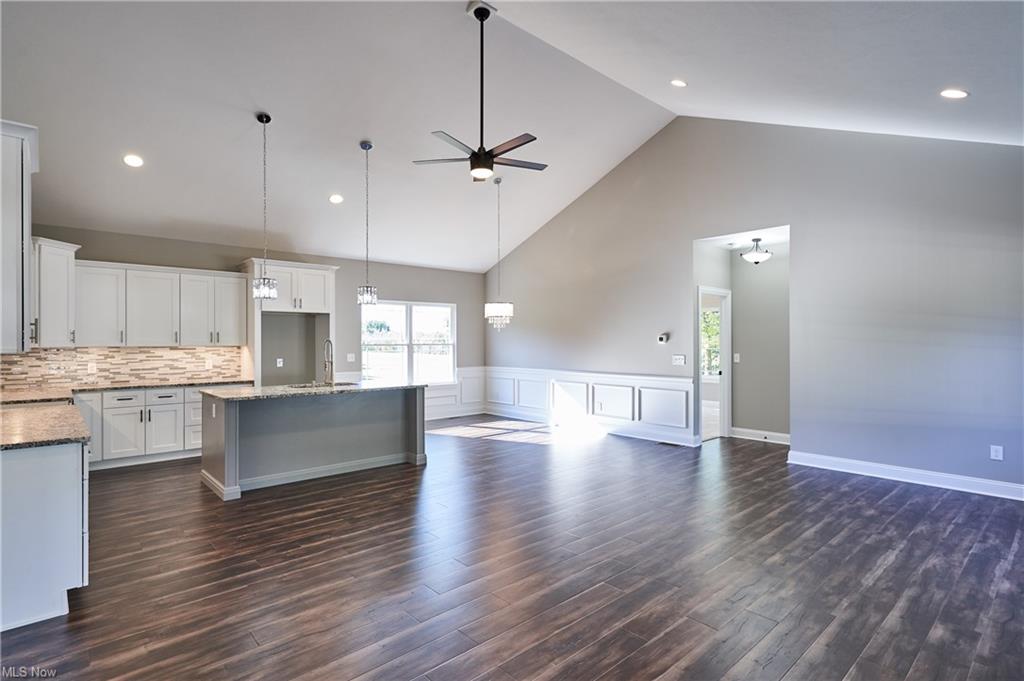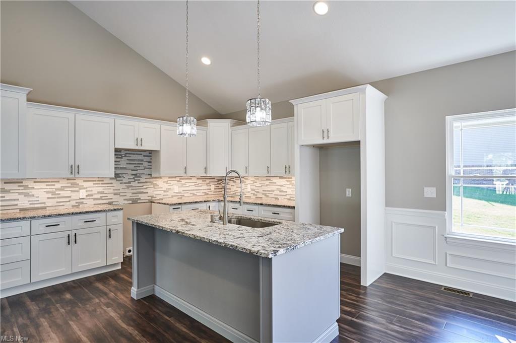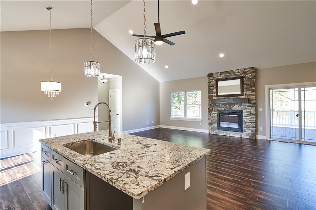 Eat-in kitchen features an expansive center island with counter seating, granite countertops and is completely open to the greatroom which opens up to a 28×14 deck.