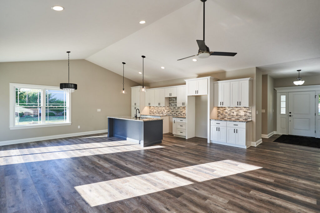 Contemporary ranch with vaulted ceilings and an open floorplan. Eat-in kitchen features an expansive center island with counter seating, granite countertops and is completely open to the great room.